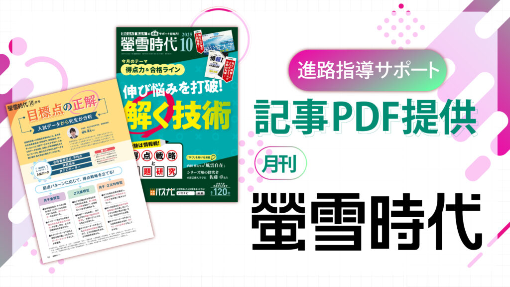『螢雪時代』シリーズでは、毎年多くの進路指導ご担当の先生方から「進路の手引き」等資料への転載のご要望をいただく定番記事をはじめ、学校での進路指導にお使いいただけるタイムリーな記事を厳選してPDFデータをご提供いたします。進路の手引き等資料の作成や、生徒への配信保護者会等での配布などにご活用ください。