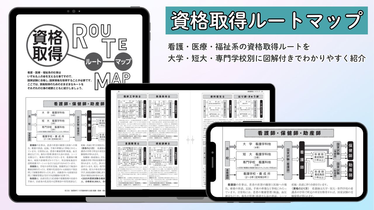 本誌の巻頭記事として掲載されている資格取得ルートマップは、この指導を強力に支援します。このルートマップでは、看護・医療・福祉の仕事に就くための進学ルートや資格取得までの流れを整理し、21種類の国家資格・任用資格を図解付きでわかりやすく紹介しています。これにより、生徒は仕事に就くための具体的な道筋を把握することができ、先生方は生徒の主体的な進路選択を導くための指導資料として、本誌を大いにご活用いただけます。