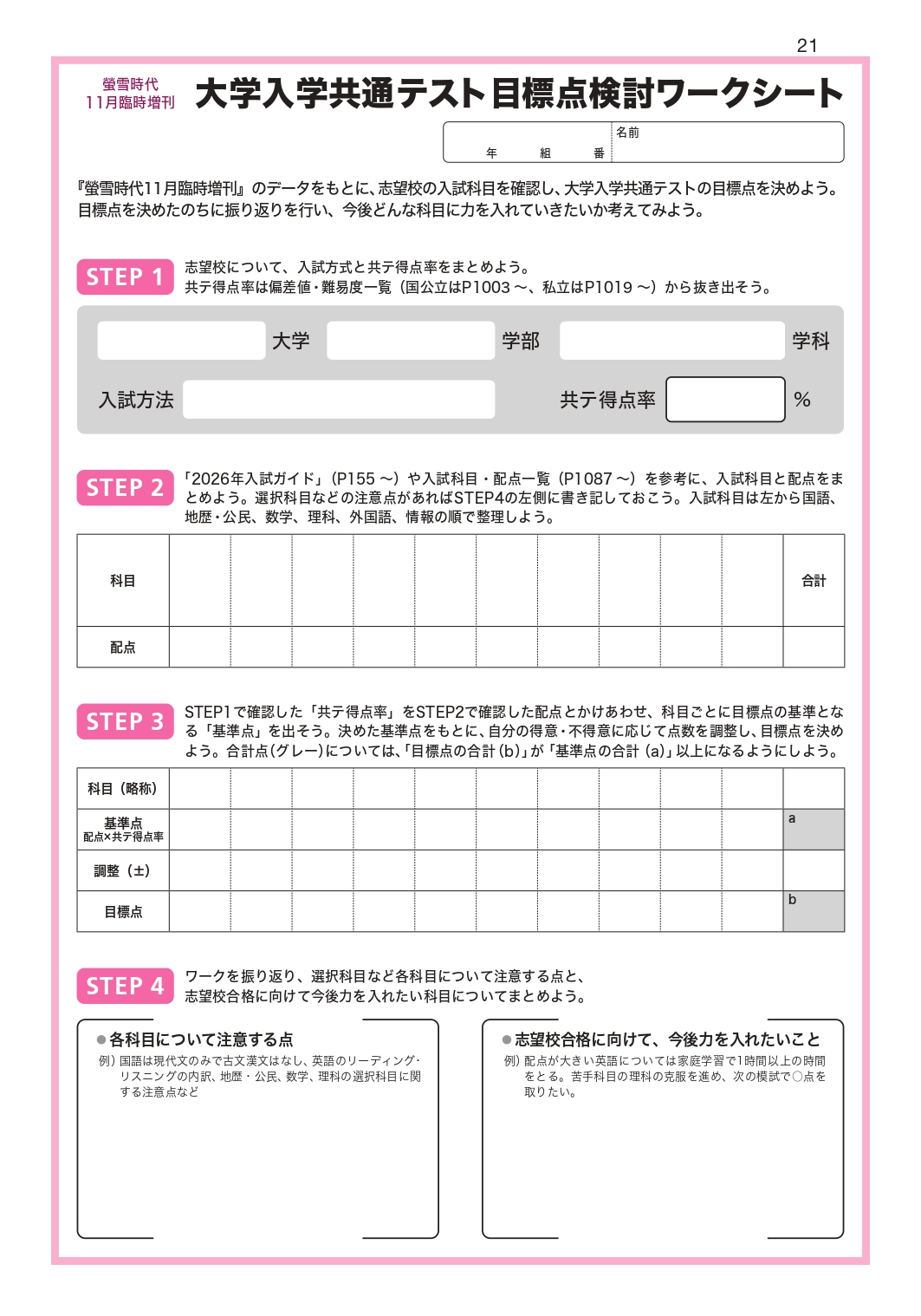 目標点と現状の差を認識したうえで、今後に取り組むべき科目や学習目標を「〇点アップを目指す」といった具体的な数値で明確化することができます。高1・2生の早めの見通し立て、3年生の直前期対策まで、共テを受験する生徒をサポートするワークシートになっています。
