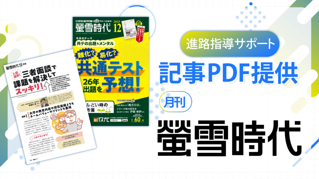 『螢雪時代』シリーズでは、毎年多くの進路指導ご担当の先生方から「進路の手引き」等資料への転載のご要望をいただく定番記事をはじめ、学校での進路指導にお使いいただけるタイムリーな記事を厳選してPDFデータをご提供いたします。進路の手引き等資料の作成や、生徒への配信保護者会等での配布などにご活用ください。