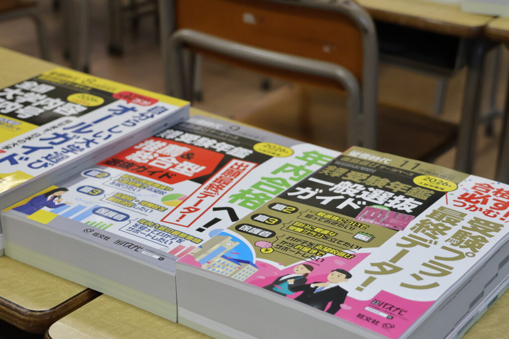 そこで、生徒に様々な学校の選択肢や受験機会を知ってもらおうと、旺文社の『螢雪時代臨時増刊』を使ったワークを実施。今回は2年生の希望者15名ほどが教室に集まり、ワークに取り組みました。利用したのは以下3冊の『螢雪時代臨時増刊』。豊富なデータをもとに大学の特徴や入試について調べていきました。