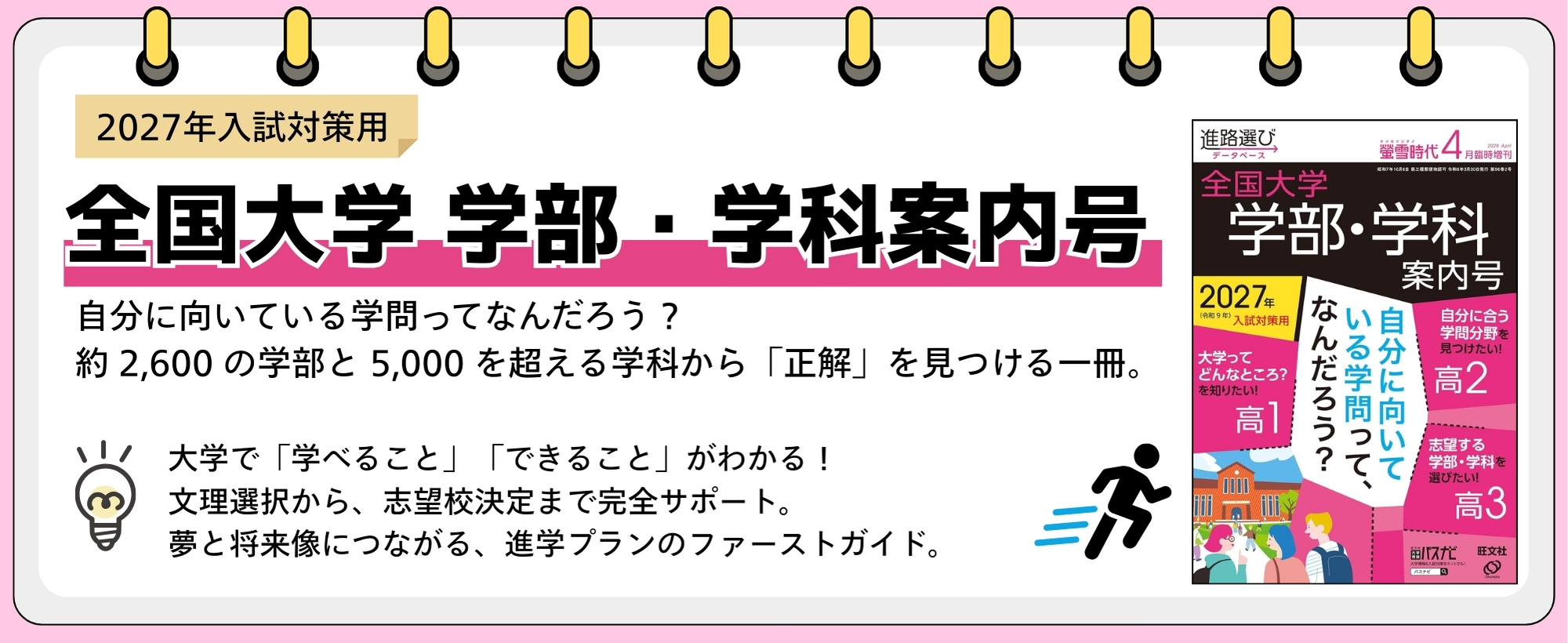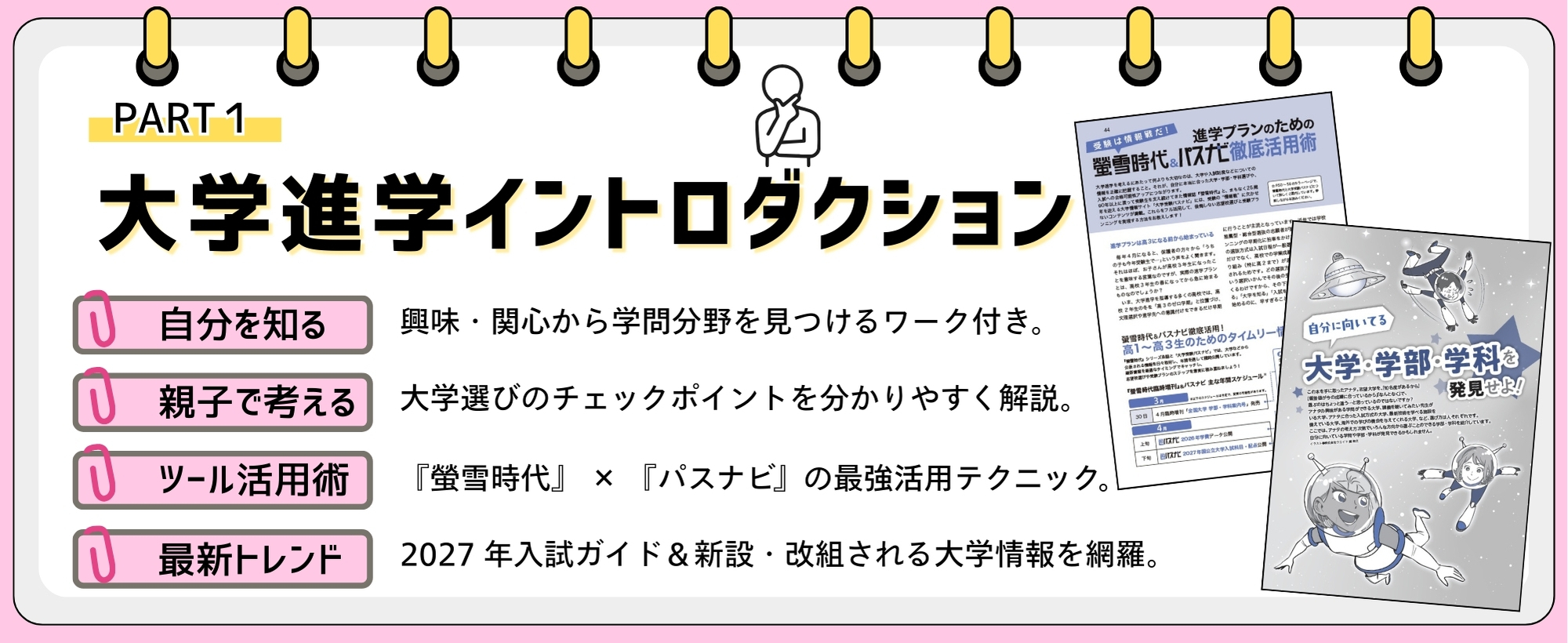 学問分野を見つけるワークや、大学選びのチェックポイントを解説。『螢雪時代』×『パスナビ』活用術や、最新トレンドの「2027年入試ガイド&新設・改組される大学情報」も網羅しています。