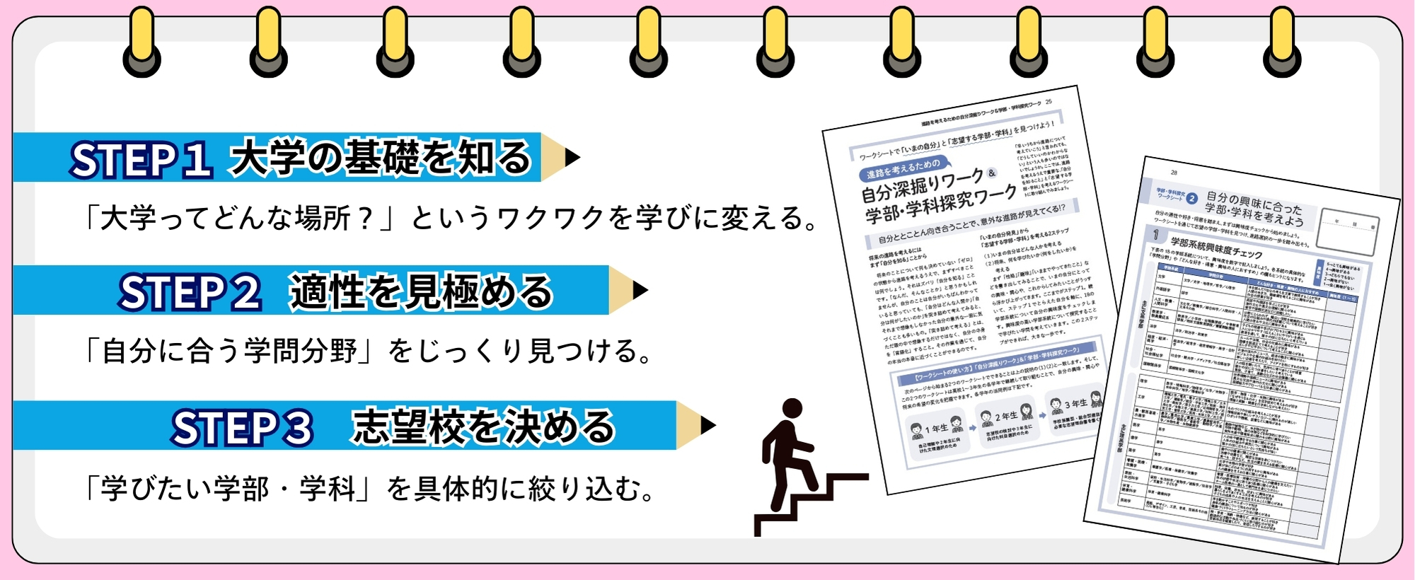 「大学の基礎を知る」「適性を見極める」「志望校を決める」の3ステップで、「学びたい学部・学科」を具体的に絞り込みます。
