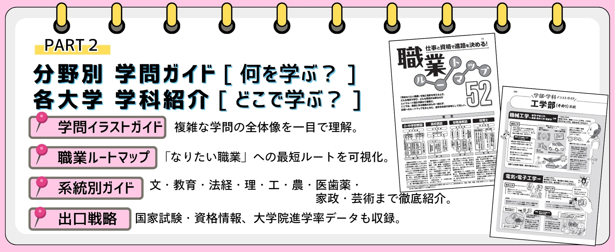 複雑な学問の全体像がわかる「学問イラストガイド」や、「なりたい職業」への最短ルートを示す「職業ルートマップ」を掲載。文系から理系、芸術まで網羅した系統別ガイドと、国家試験等の「出口戦略」も充実しています。