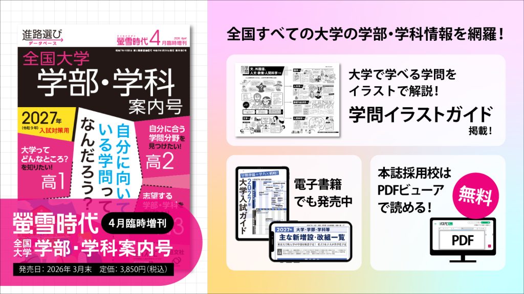 『螢雪時代4月臨時増刊 全国大学 学部・学科案内号』(3月30日発売)では、約2,600の学部と5,000を超える学科から、生徒が自分に向いている学問の「正解」を見つけるためのファーストガイドとして、この時期にふさわしい特集を組んでいます。大学で「学べること」「できること」がわかり、文理選択から志望校決定までを完全サポートする内容となっています。生徒へのご案内や、進路指導の参考資料などとしてぜひご活用ください。