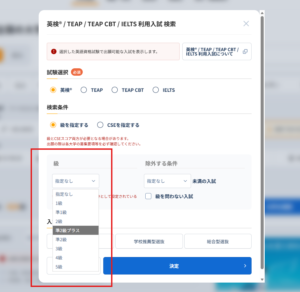 [詳しい条件 「英検® TEAP IELTS」] から検索条件で 「級を指定する」 を選択すると、