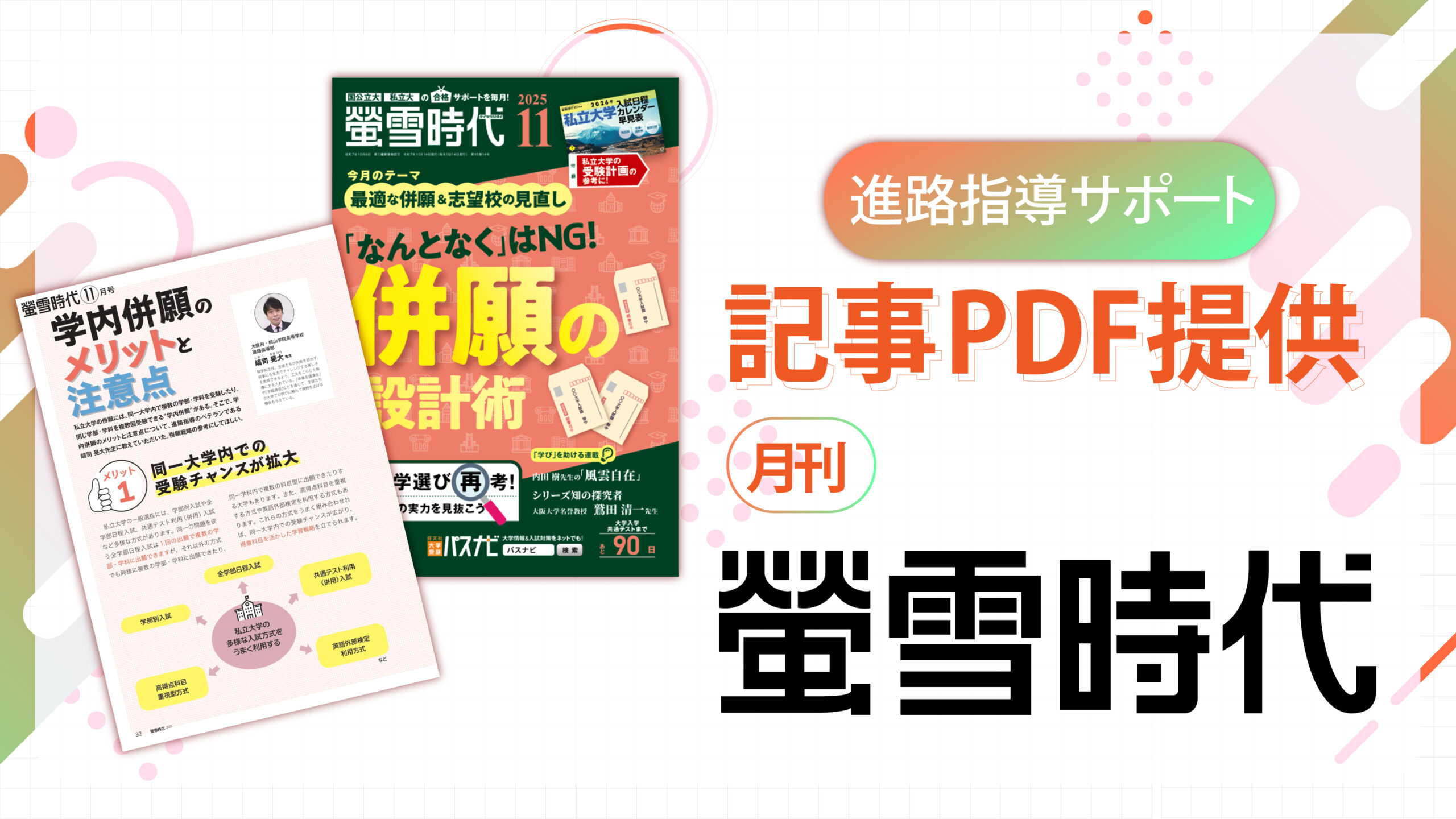先生方におかれましては、学校推薦型・総合型選抜が本格化し、年内入試指導の佳境を迎えていることかと存じます。このたび、螢雪時代臨時増刊シリーズの電子書籍第2弾として、『螢雪時代9月臨時増刊 推薦&総合型選抜ガイド』電子書籍版を1… -